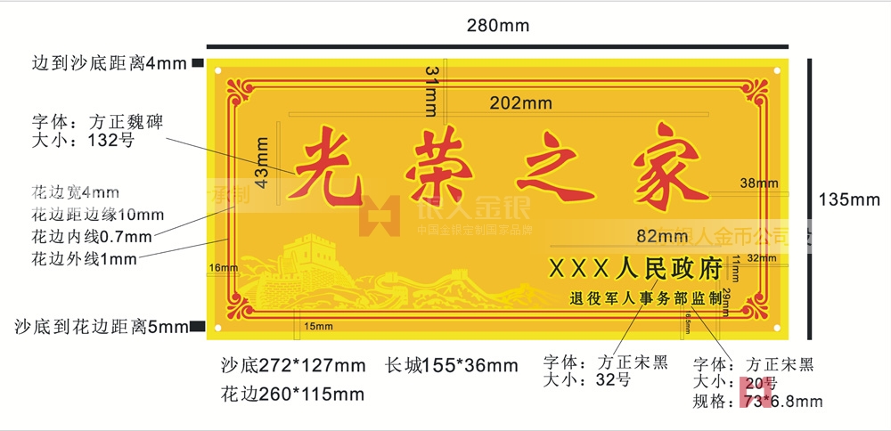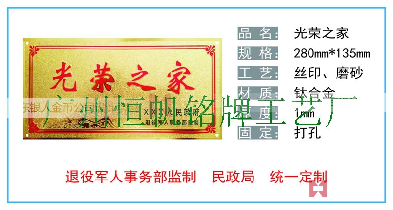 退役軍人事務部/政府部門民政廳統一懸掛安裝光榮之家牌匾/光榮牌制作標準規格尺寸技術參數生產廠家