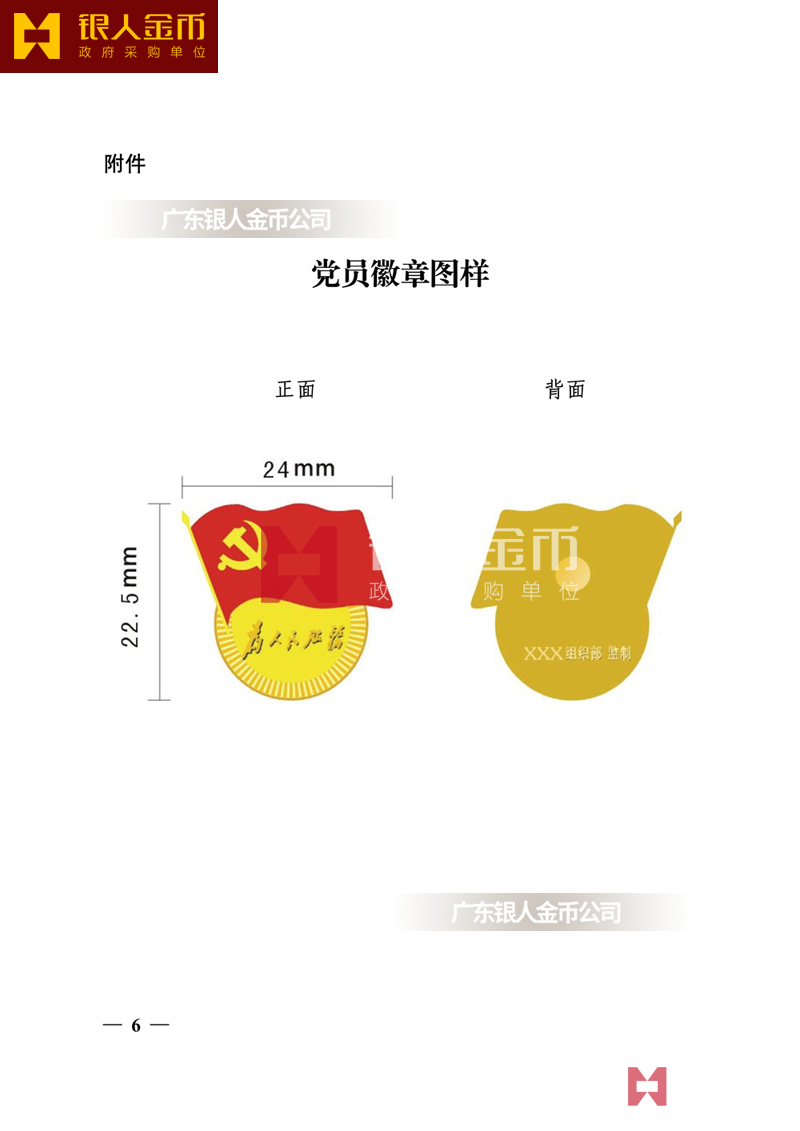 黨員徽章黨徽尺寸為 24mm×22. 5mm×2mm,材質為鋅掛鍍仿金。