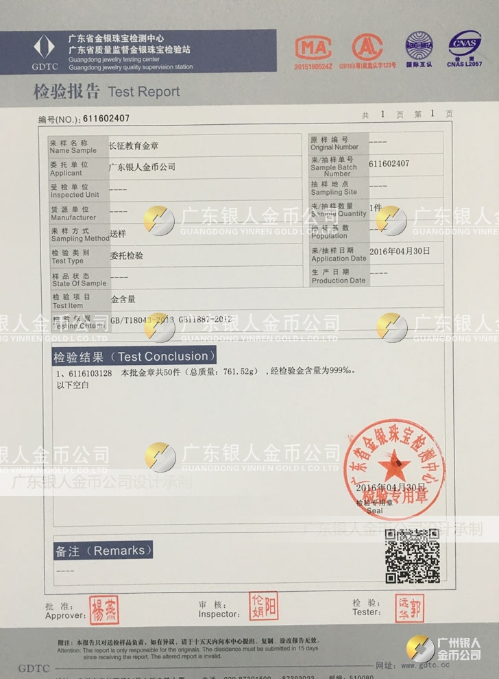 廣東銀人金幣公司承接客戶個性化定制的金銀幣、金銀章、金銀條、金銀牌、金銀盤均由國家質(zhì)監(jiān)部門、嚴(yán)格檢測、權(quán)威鑒定: