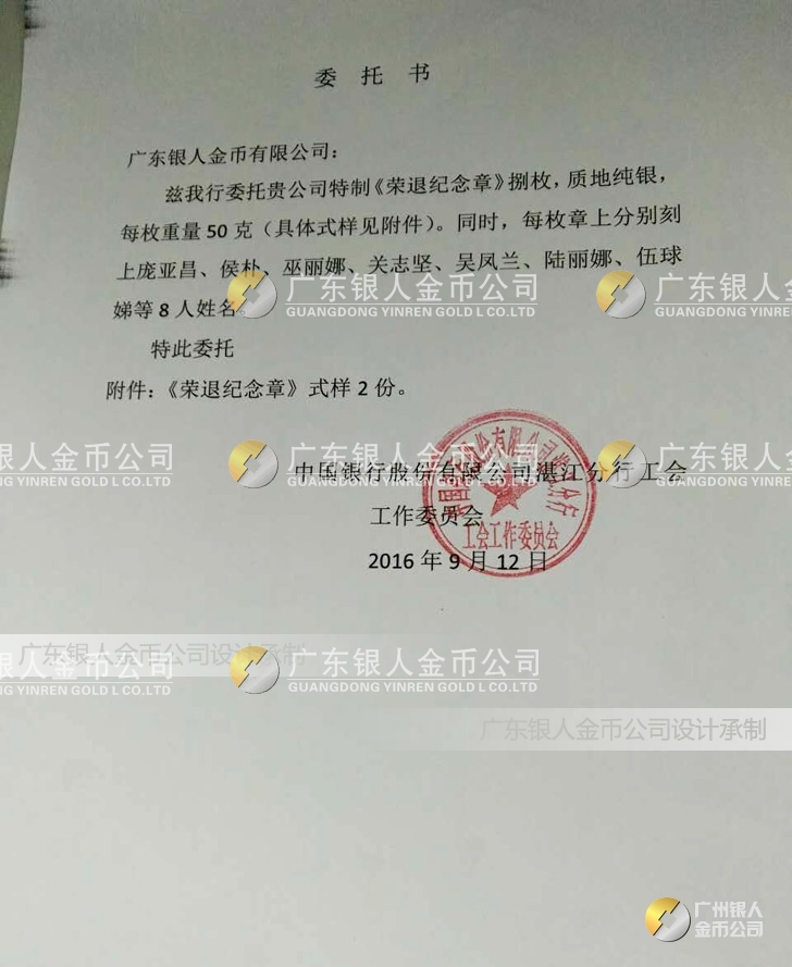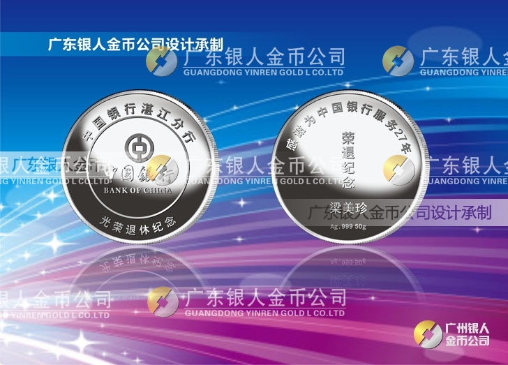 廣東銀人金幣公司,是集紀念章、獎章、勛章設計、研發、定制并服務于榮譽稱號全表彰獎勵周期管理,致力于證章文化產業發展和徽章信息化研究的大型生產制造獨資企業,是國家級紀念章、獎章的設計者(外包)、制造者(定點)和維護者(認可),金銀章綜合解決方案的提供者。在全國獎章勛章領域,廣東銀人金幣公司擁有專業的勛章產業規模、齊全的證章門類和完整的紀念章產業鏈條。